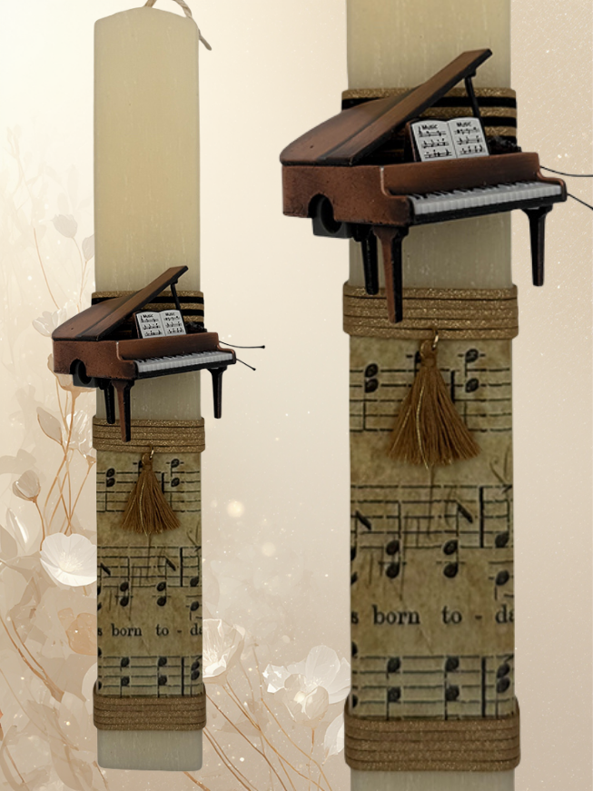 Χειροποίητη πασχαλινή λαμπάδα σε φυσική εκρού απόχρωση, διακοσμημένη με ξύστρα σε σχήμα πιάνου και μουσικά μοτίβα.