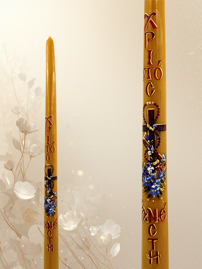 Η λαμπάδα συνδυάζει τη φυσική απόχρωση του μελιού με την πασχαλινή συμβολική διακόσμηση και αποτελεί ιδανική επιλογή για την Ακολουθία της Αναστάσεως, για πασχαλινό δώρο ή για προσωπική πνευματική χρήση.