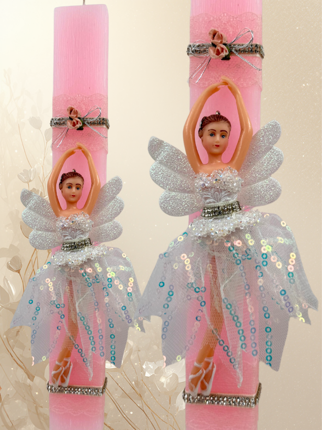 Εντυπωσιακή χειροποίητη πασχαλινή λαμπάδα σε απαλό ροζ χρώμα, διακοσμημένη με κομψή μπαλαρίνα με λαμπερά φτερά και φούστα από τούλι με παγιέτες. Η διακόσμηση ολοκληρώνεται με ασημί κορδέλες και διακριτικές λεπτομέρειες στρας, δημιουργώντας ένα ρομαντικό και παραμυθένιο αποτέλεσμα.