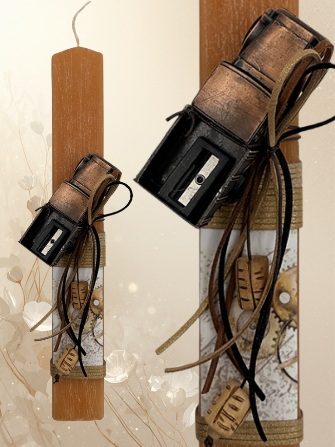 Χειροποίητη πασχαλινή λαμπάδα σε γήινη καραμελέ απόχρωση, διακοσμημένη με vintage μεταλλική ξύστρα σε στυλ παλαιού εργαστηρίου.