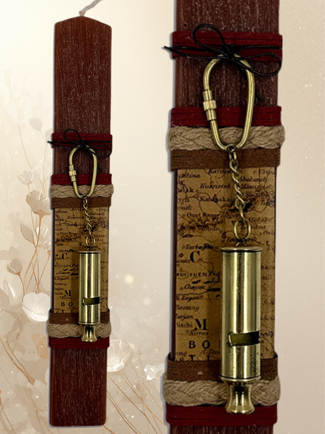 Διακοσμείται με μεταλλική σφυρίχτρα σε vintage αισθητική, δεμένη με γήινες υφές, σχοινί και διακοσμητικά στοιχεία που θυμίζουν παλαιό χάρτη.