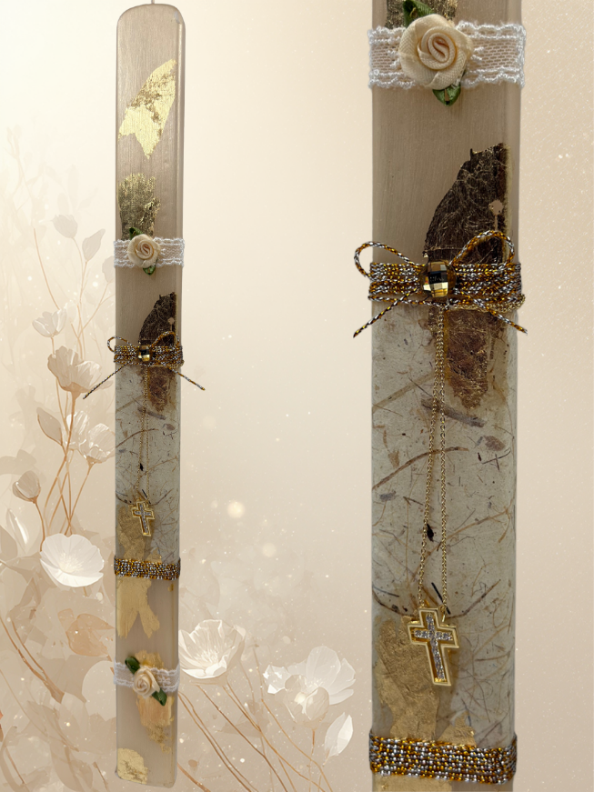 Χειροποίητη πασχαλινή λαμπάδα σε φυσική εκρού απόχρωση, διακοσμημένη με αυθεντικά φύλλα χρυσού και φυσικά διακοσμητικά στοιχεία. Συνοδεύεται από μεταλλικό σταυρό σε αλυσίδα, σε κομψό βυζαντινό ύφος.