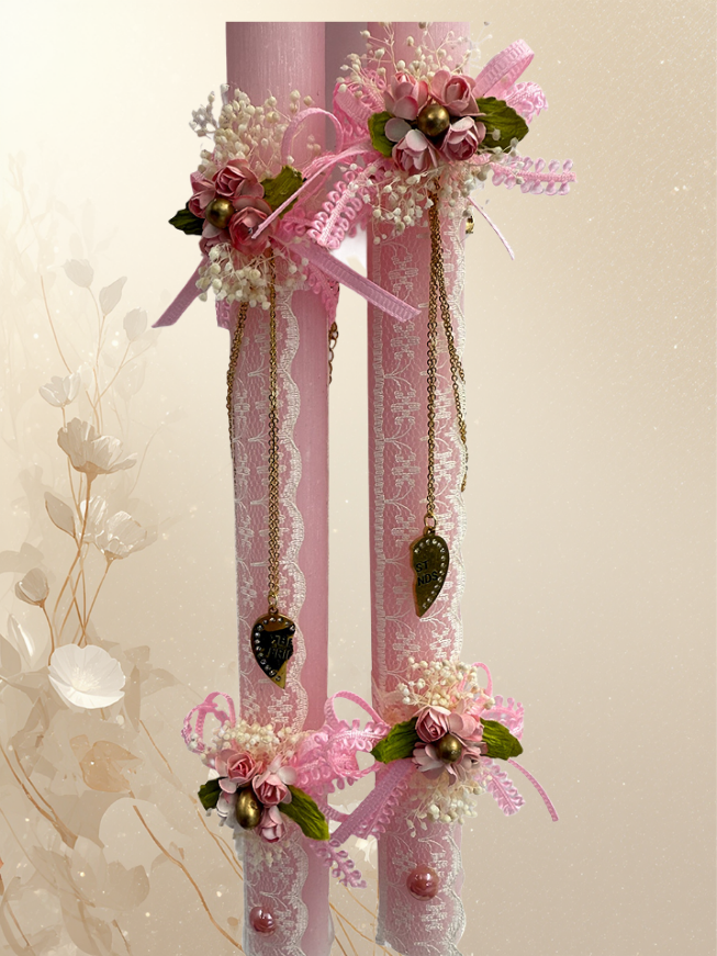 Χειροποίητη πασχαλινή λαμπάδα σε απαλό ροζ χρώμα, διακοσμημένη με φίνα δαντέλα, ρομαντικές ανθοσυνθέσεις και κρεμαστό μεταλλικό στοιχείο σε σχήμα καρδιάς.